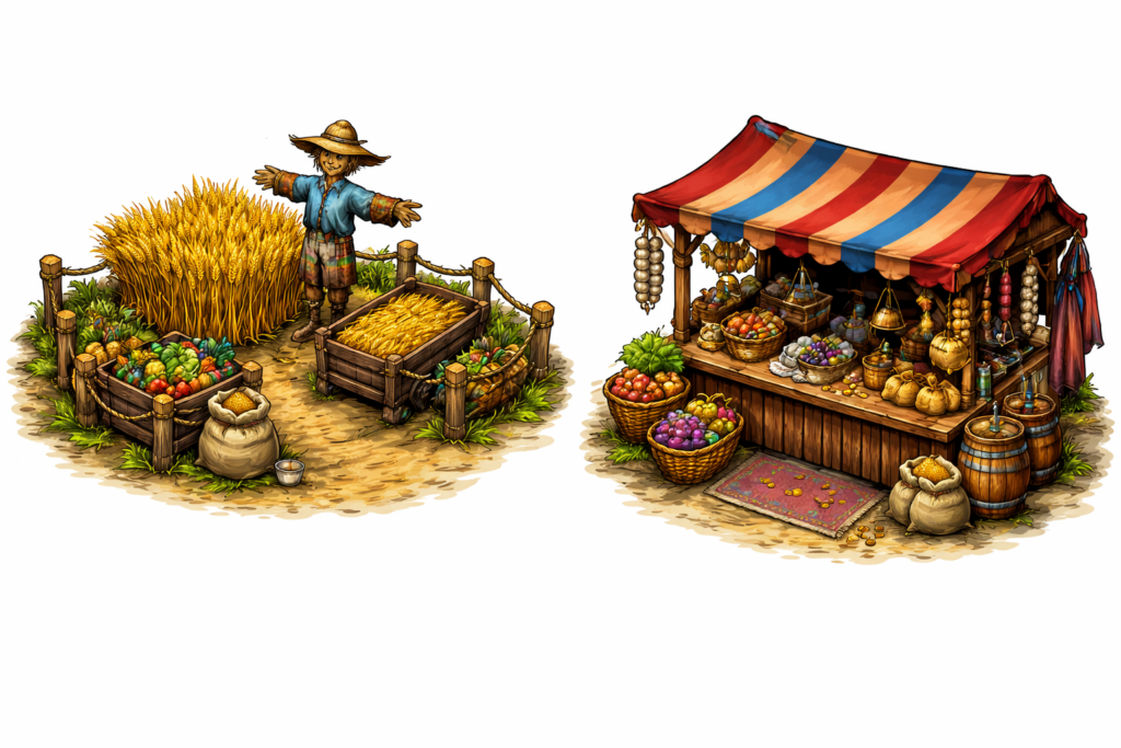 - Construction et évolution : maisons, casernes, fermes, mines et structures défensives.